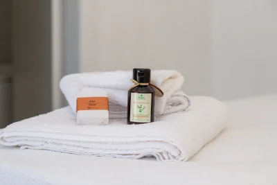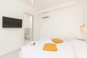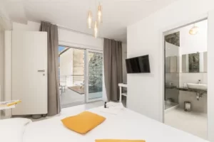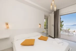 Camera matrimoniale con una spaziosa terrazza arredata con salottino e sedie sdraio.