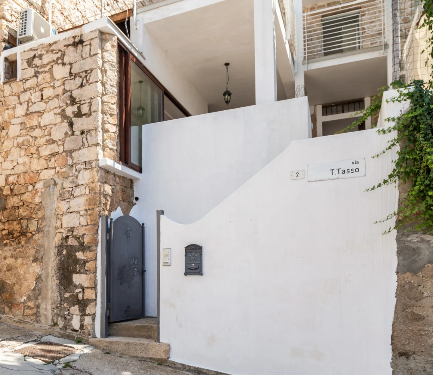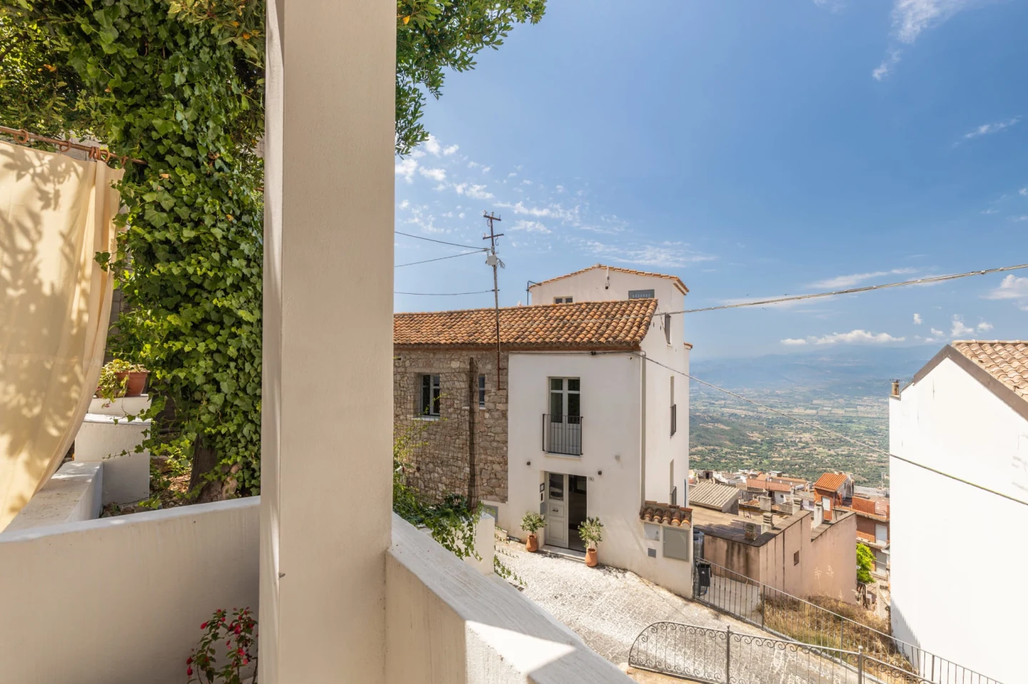 Dal cancelletto esterno, si accede a una grande terrazza con giardino e vista sulla collina, dove domina un grande albero di Alloro quasi centenario.