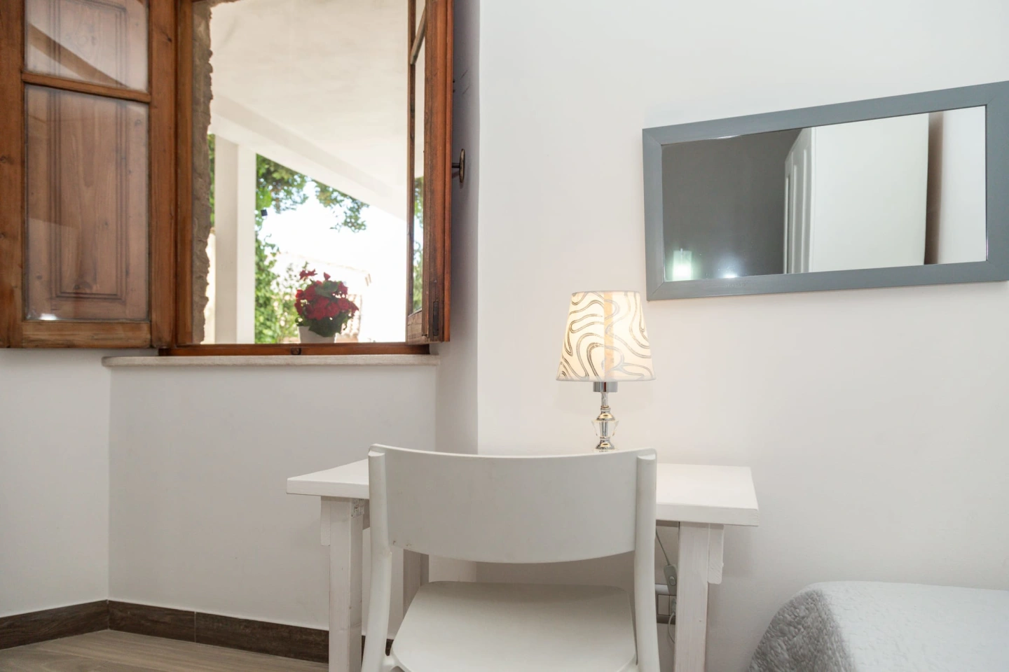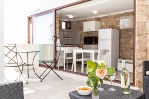 Dal cancello sulla strada, percorrendo due piccole rampe di scale, si giunge a un’ampia terrazza con vista sulla collina, davanti a voi il portone per accedere  alla camera da letto e al bagno mentre sulla sinistra, da una ampia vetrata che si apre totalmente, si accede a una piccola cucina dove troverete tutto il necessario per preparare  i vostri pasti che potrete gustare nella terrazza con vista sulla collina.